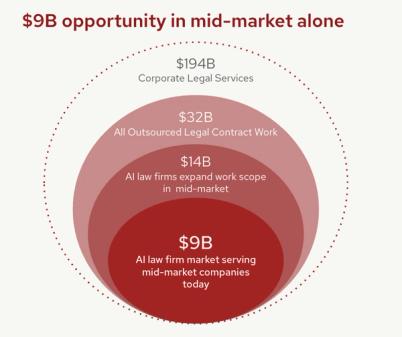 The corporate legal landscape is defined by massive spending that rarely reaches those who need it most. While the total market for corporate legal services currently sits at $194Bn, a significant $32Bn slice is already being diverted to outsourced contract work. We see a specific $9Bn opportunity in the mid-market alone for AI-powered outsourced operators. While this segment is currently underserved by traditional firms, it is also overlooked by existing enterprise-oriented AI apps, creating a particularly opportune wedge.
