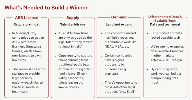 Regulatory Moat: The most strategic founders are securing Alternative Business Structure (ABS) licenses in states like Arizona and Utah, which allow non-lawyers to own law firms. This regulatory unlock makes it possible for startups to scale legal services nationwide with venture-backed velocity rather than partnership-committee pace.
